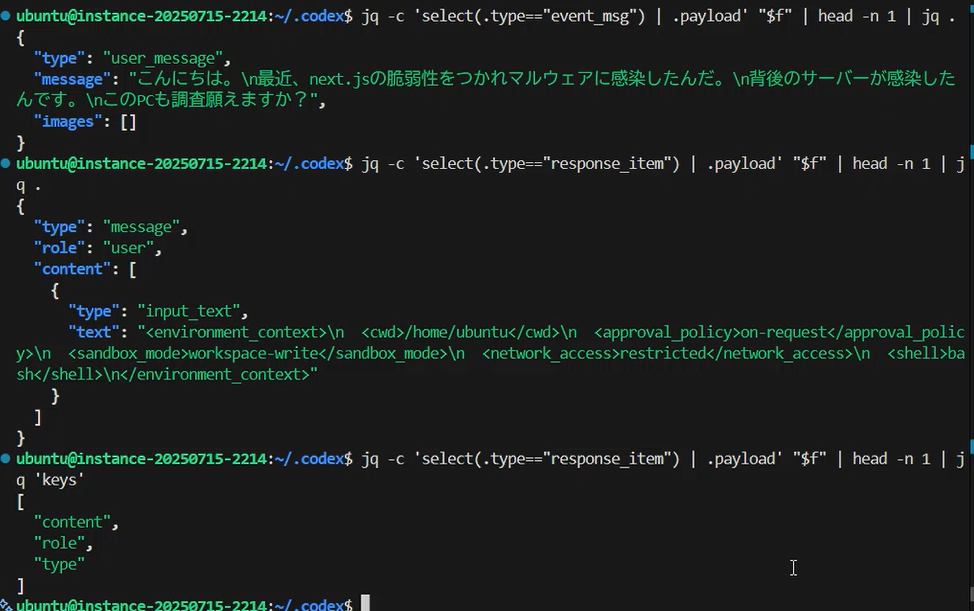 | Búsqueda por palabra clave | rg "palabra clave" rollout-*.jsonl |