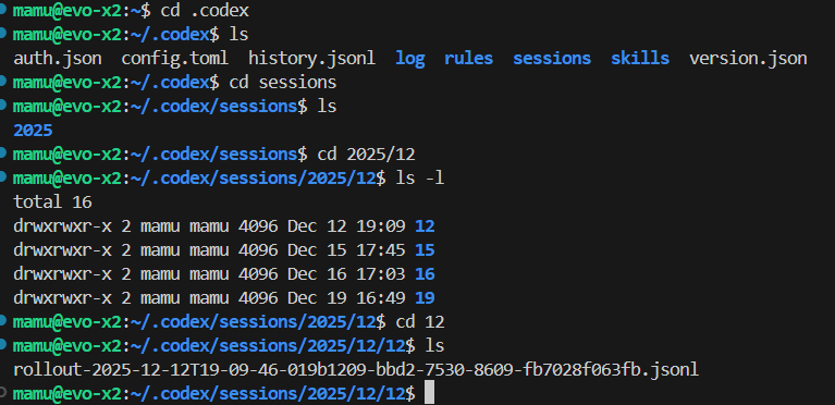 | Verificar ubicación del registro | ls ~/.codex/sessions/ |