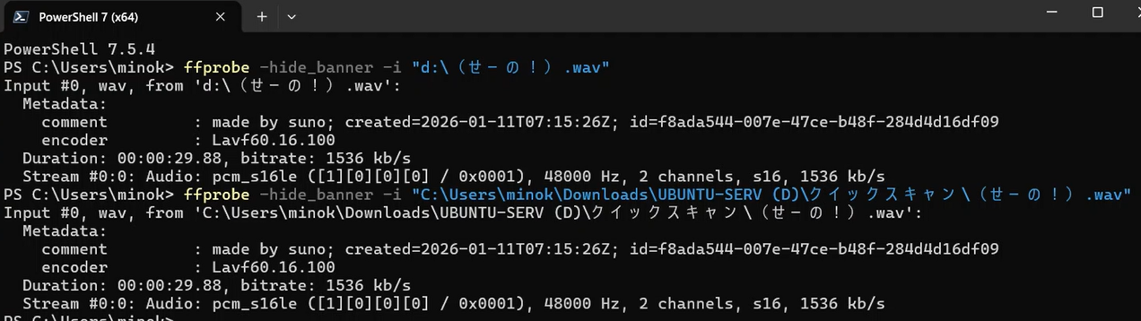 Para archivos de audio, hay otra forma útil de verificar la integridad además del hash. Usando ffprobe, puedes comprobar la duración, el formato, la tasa de bits y otros metadatos.
