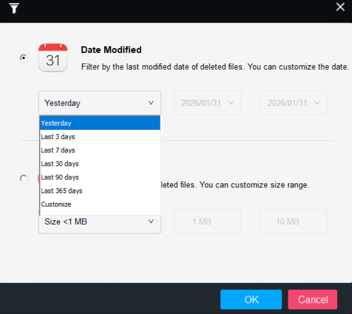 Si eliminaste accidentalmente un archivo importante, comienza con un Análisis rápido: es veloz y cubre los escenarios más comunes. Si no encuentras lo que buscas, cambia al Análisis con IA para una búsqueda más profunda y usa los filtros de fecha y tamaño para acotar los resultados.