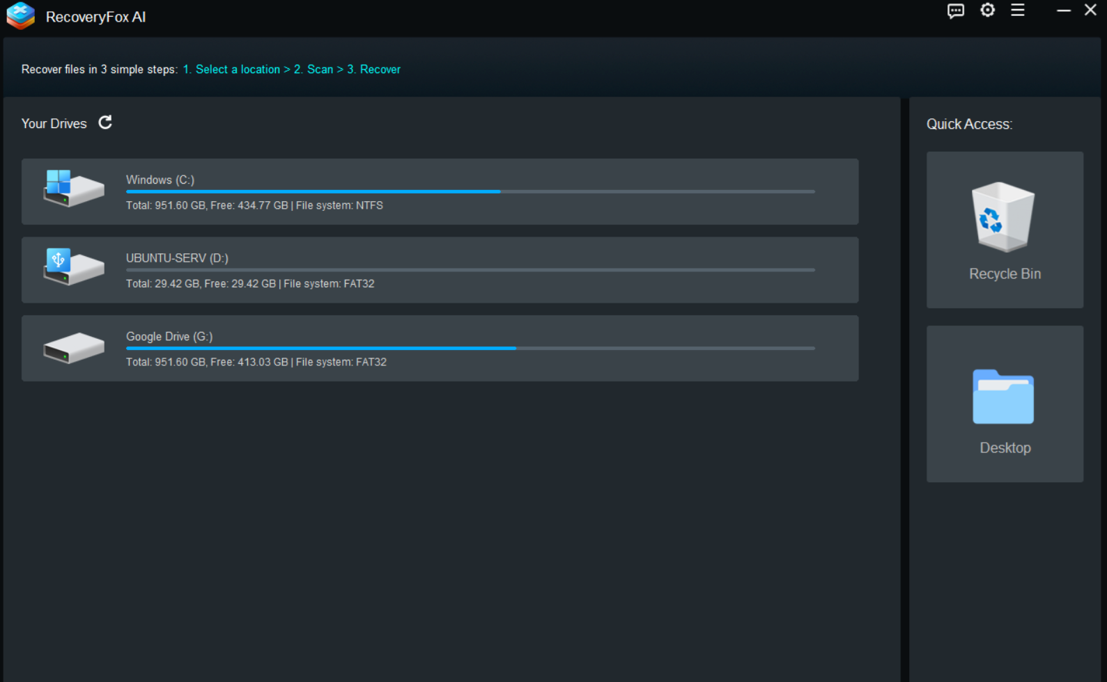 RecoveryFox AI es una herramienta de recuperación que analiza tu disco en busca de rastros de archivos eliminados y los restaura.